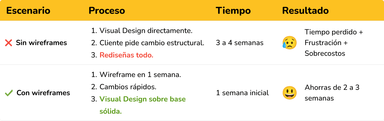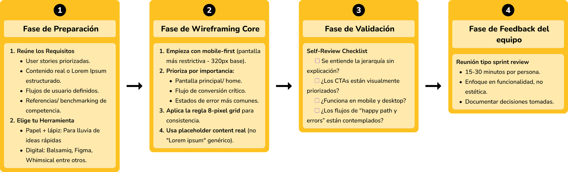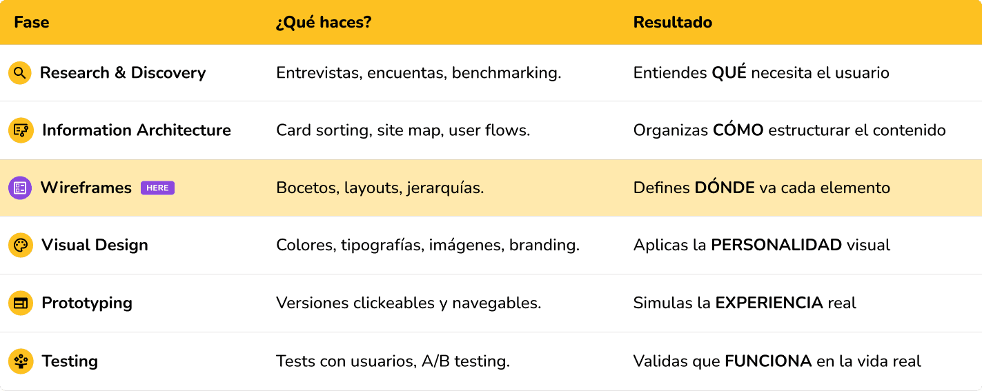 Los wireframes no son el primer paso, ni el último. Son parte de una metodología probada que usan equipos de diseño en Google, Airbnb, Spotify y miles de startups exitosas.